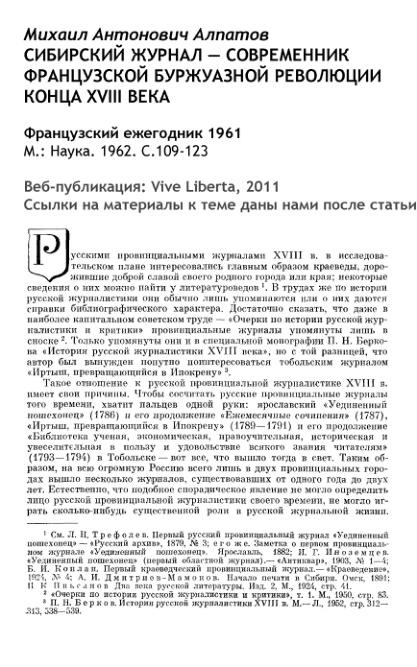Сибирский журнал — современник французской буржуазной революции конца XVIII века