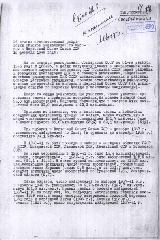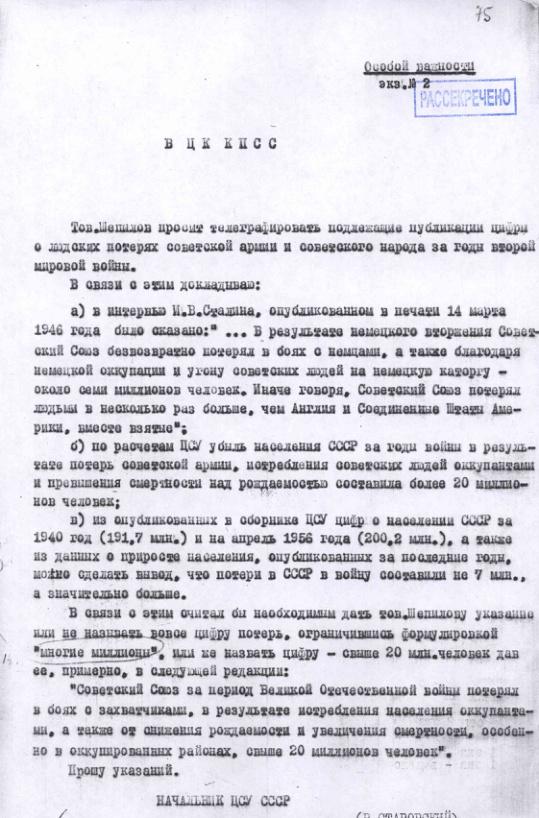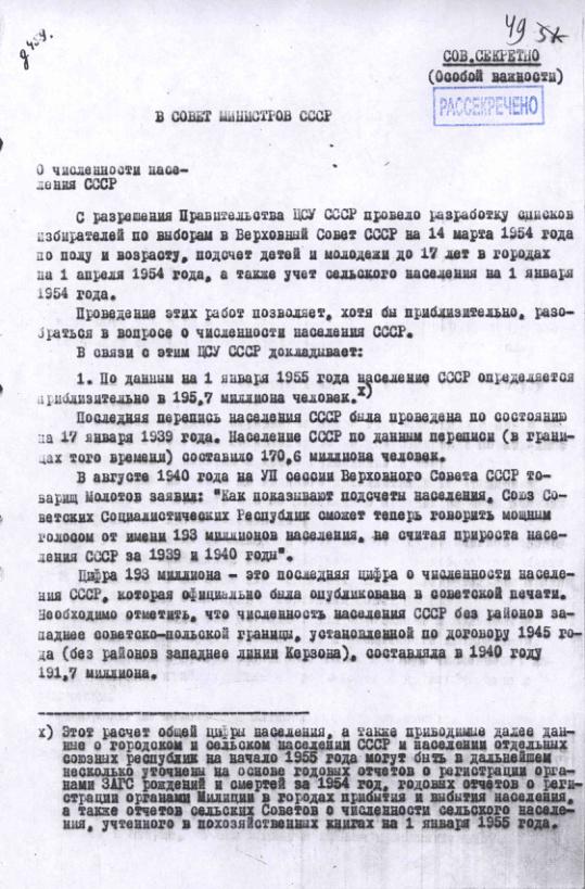 Записка ЦСУ о публикации цифр потерь населения СССР в Великой Отечественной Войне. 1956 г.