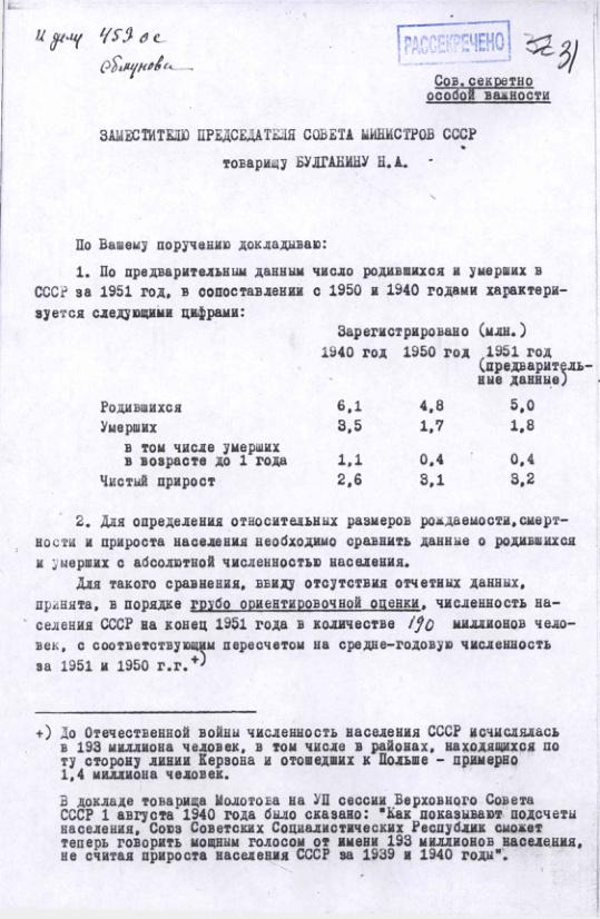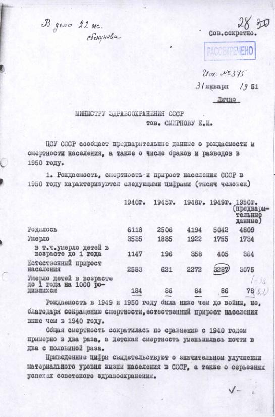 Справка о естественном движении населения СССР в 1940, 1945, 1948-1950 гг. 31 января 1951 г.