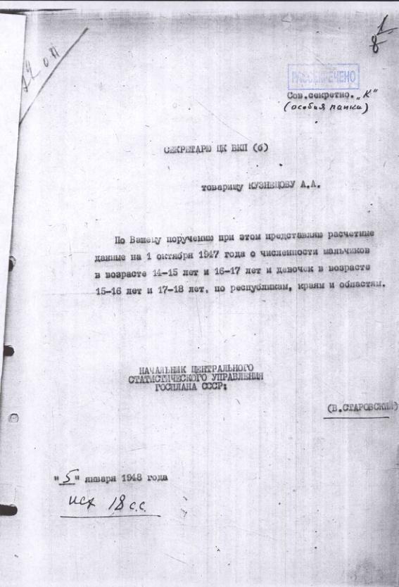 Справка ЦСУ о численности молодежи СССР до 18 лет на 1 октября 1947 г.