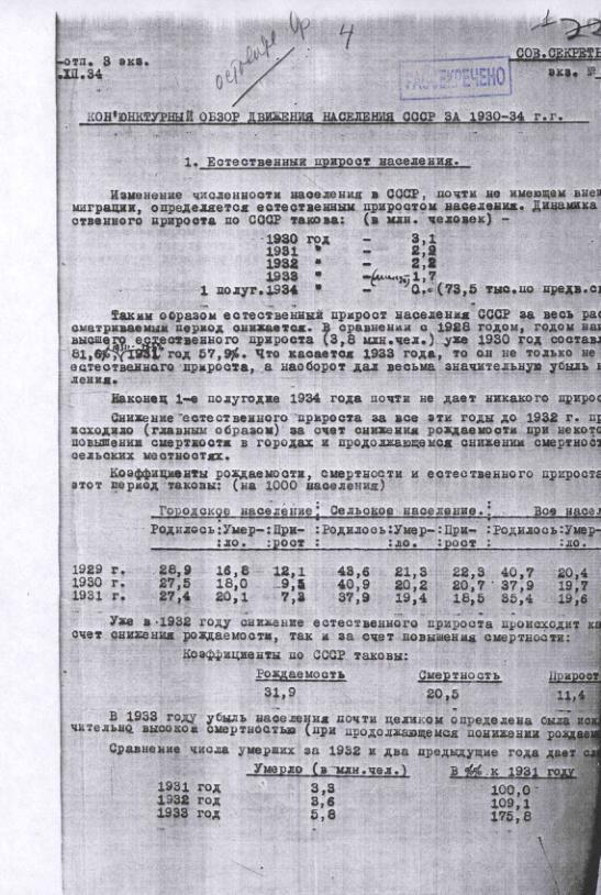 Конъюнктурный обзор движения населения СССР за 1930-1934 гг. 3 декабря 1934 г.