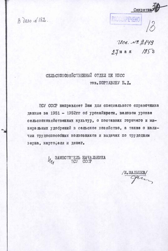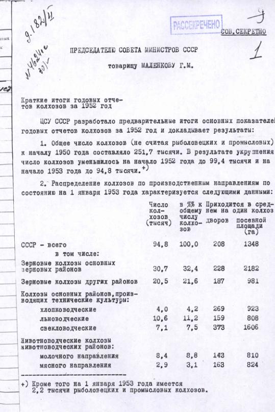 Краткие итоги годовых отчетов колхозов за 1952 год. Май 1953 г.