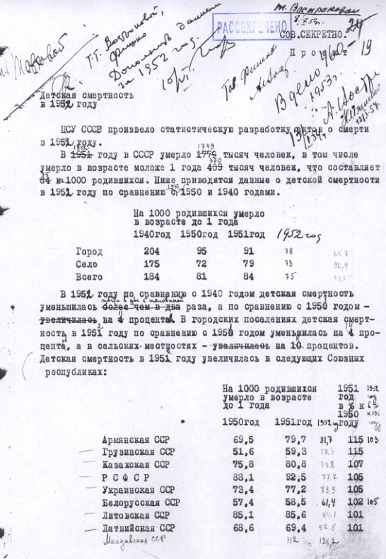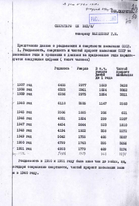 Справка ЦСУ о рождаемости и смертности населения в СССР в 1937-1940, 1950-1952 гг. 28 марта 1953 г.