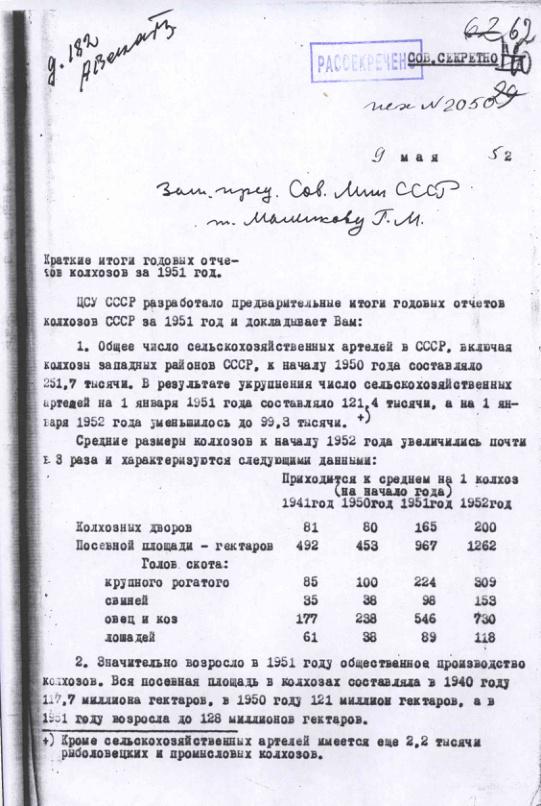 Краткие итоги годовых отчетов колхозов за 1951 год. 9 мая 1952 г.