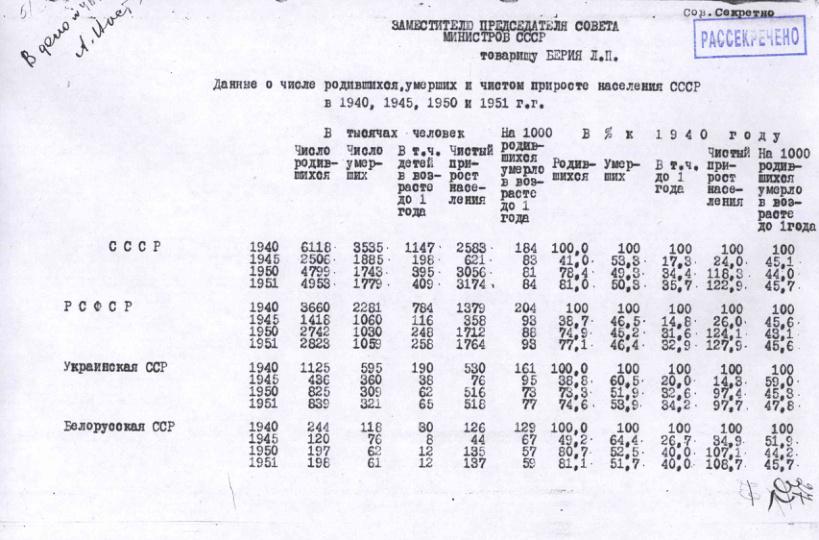 Справка о рождаемости и смертности населения в СССР в 1940, 1950-1952 гг. Март 1953 г.