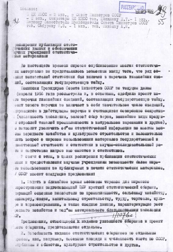 Докладная записка о расширении публикаций статистических данных. 9 марта 1956 г.