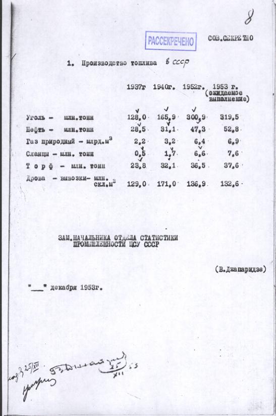 Справка ЦСУ о производстве топлива в СССР в 1937, 1940, 1952-1953 гг. Декабрь 1953 г.