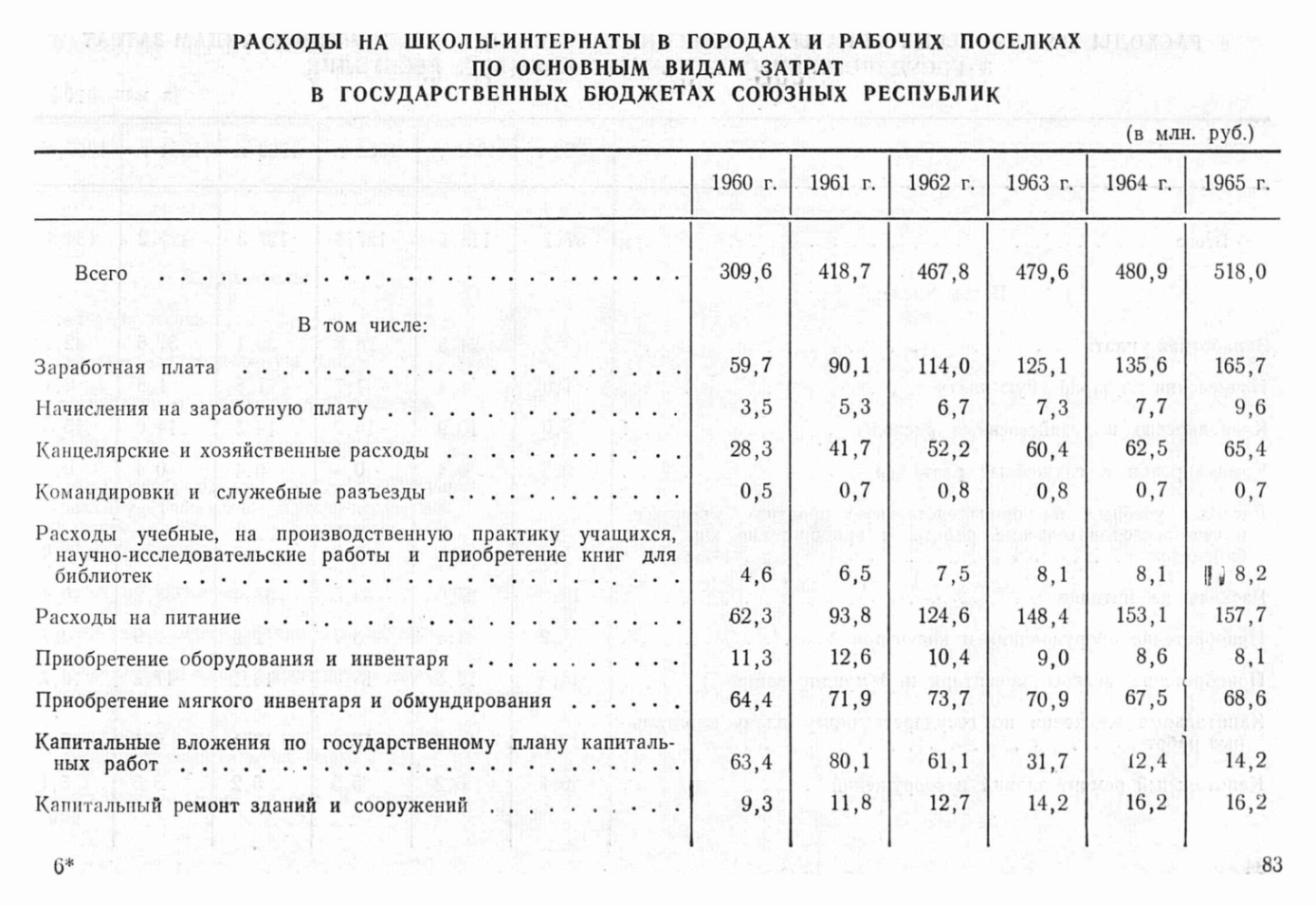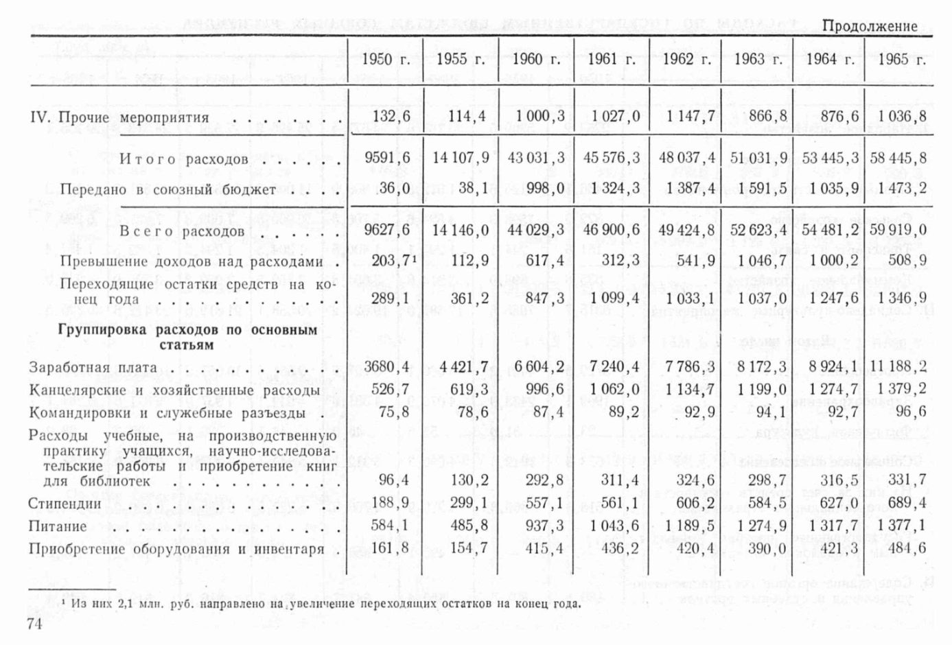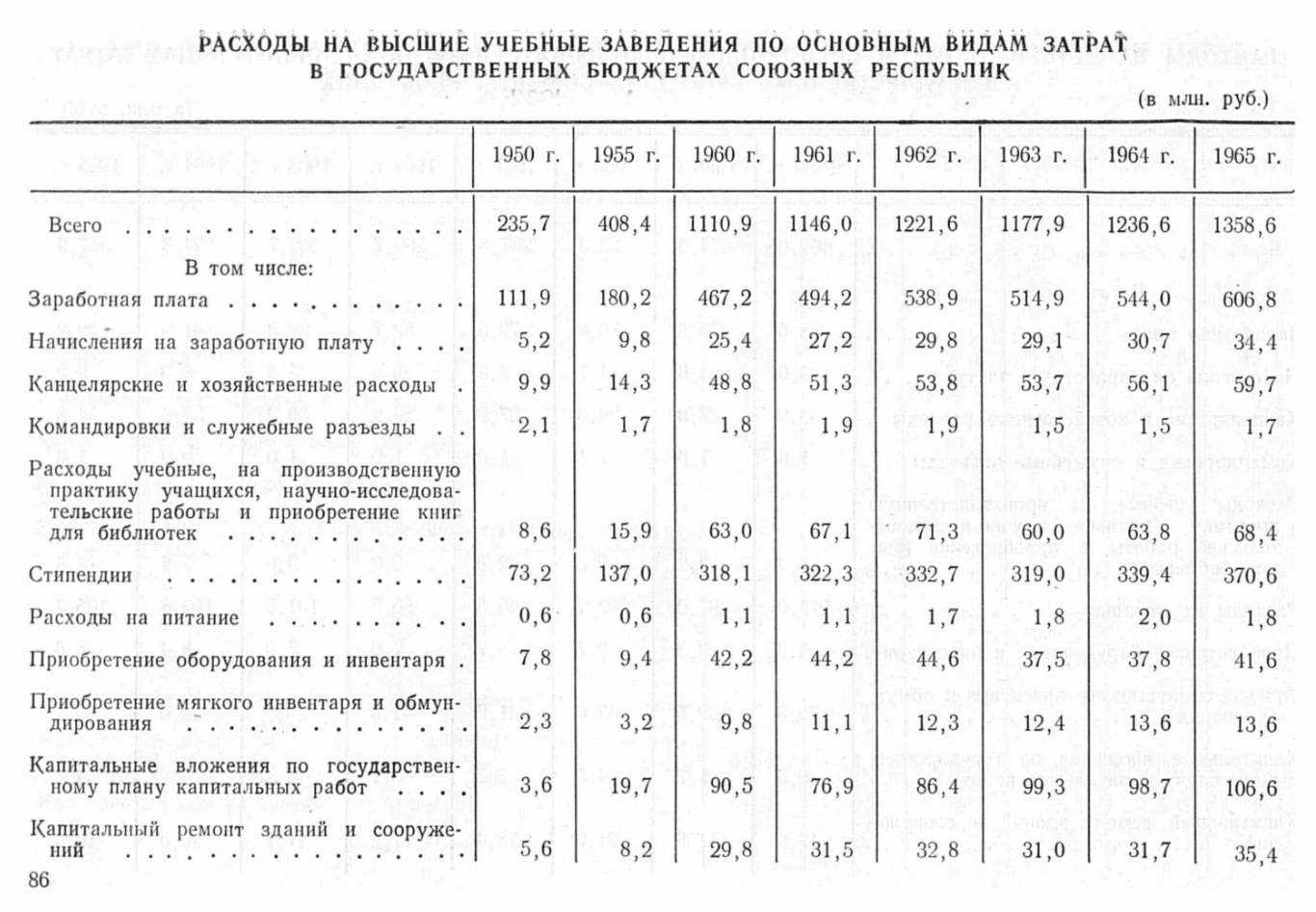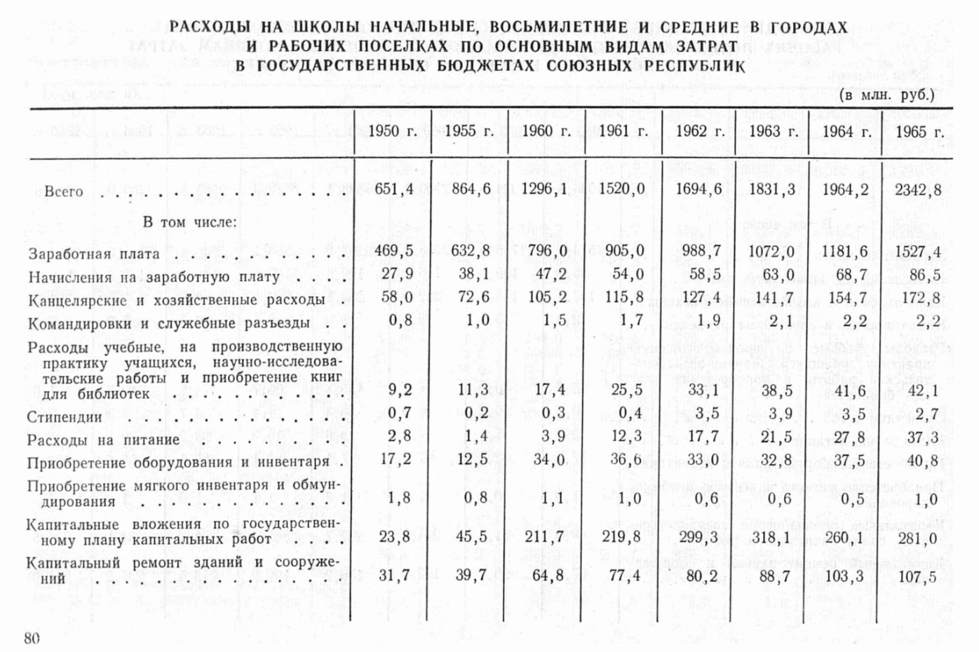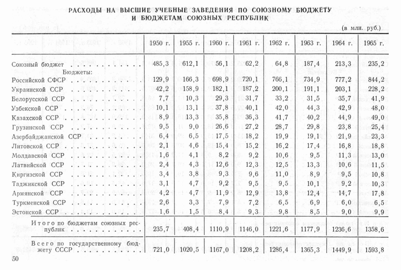 Распределение расходов по видам местных бюджетов РСФСР в периоды 1950, 1955, 1961-1965 годов