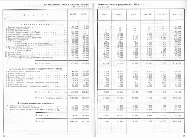 Свод контрольных цифр по доходам местных бюджетов союзных республик на 1933 г.