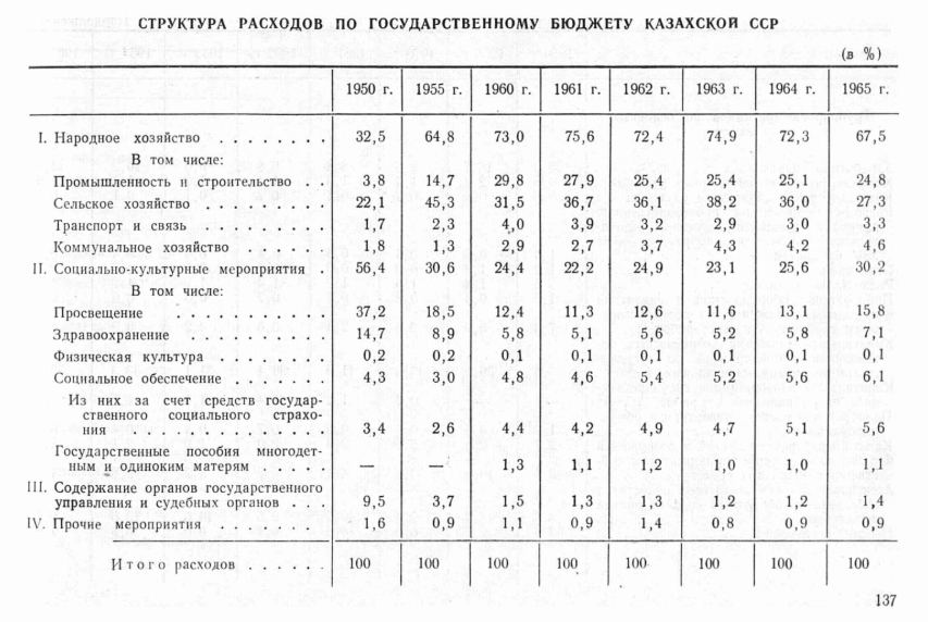 Структура расходов по государственному бюджету Казахской ССР в периоды 1950, 1955, 1960-1965 годов (в %) |