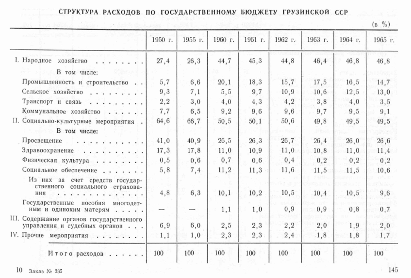 Структура расходов по государственному бюджету Грузинской ССР в периоды 1950, 1955, 1960-1965 годов (в %) |