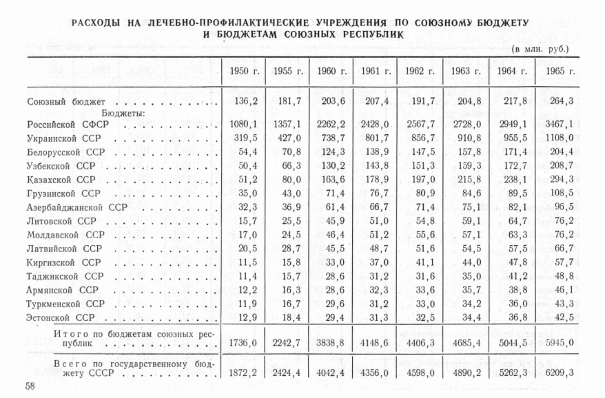 Расходы на лечебно-профилактические учреждения по союзному бюджету и бюджетам союзных республик в периоды 1950, 1955, 1960-1965 (в млн руб.)
