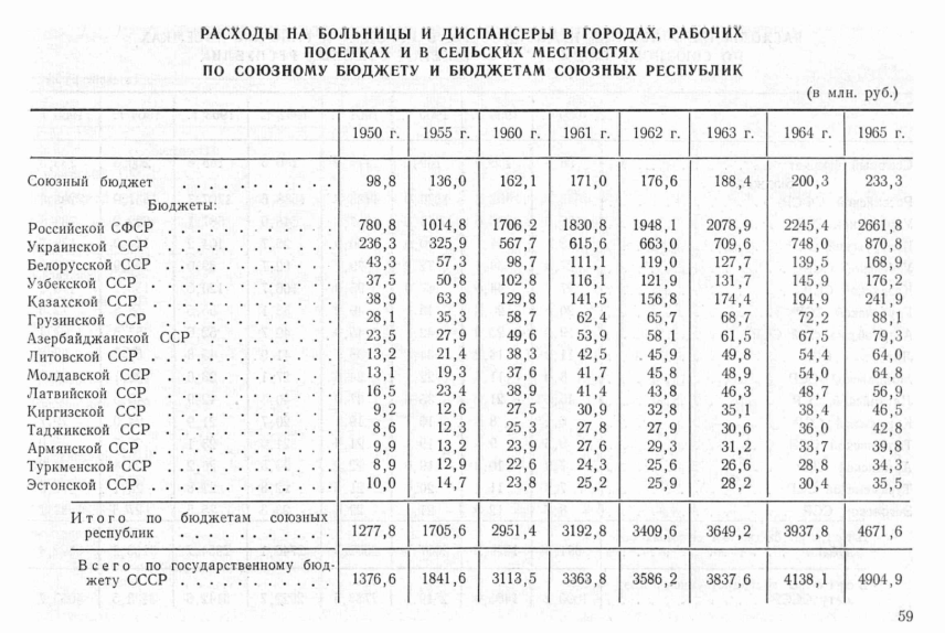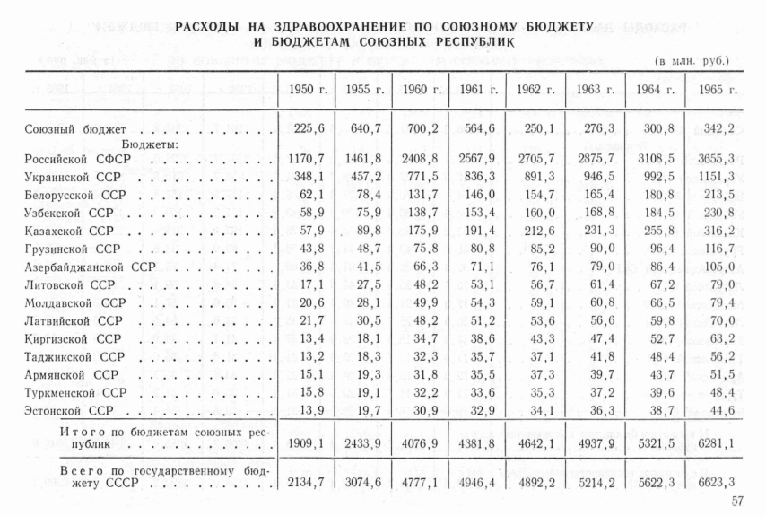 Расходы на здравоохранение по союзному бюджету и бюджетам союзных республик в периоды 1950, 1955, 1960-1965 (в млн руб.)