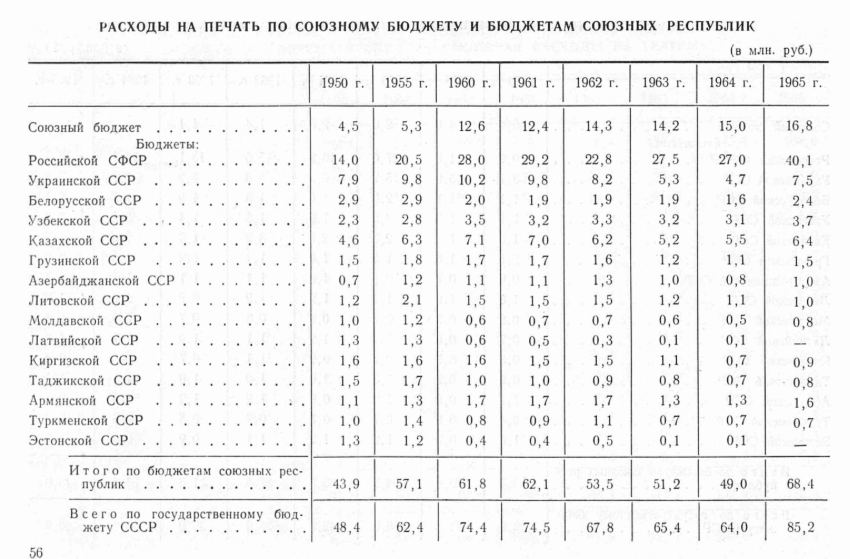 Расходы на печать по союзному бюджету и бюджетам союзных республик в периоды 1950, 1955, 1960-1965 (в млн руб.)