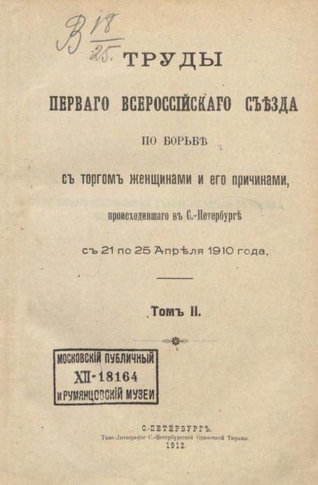 Труды первого всероссийского съезда по борьбе с торгом женщинами и его причинами, проходившего в С.-Петербурге с 21 по 25 апреля 1910 г. Том 2