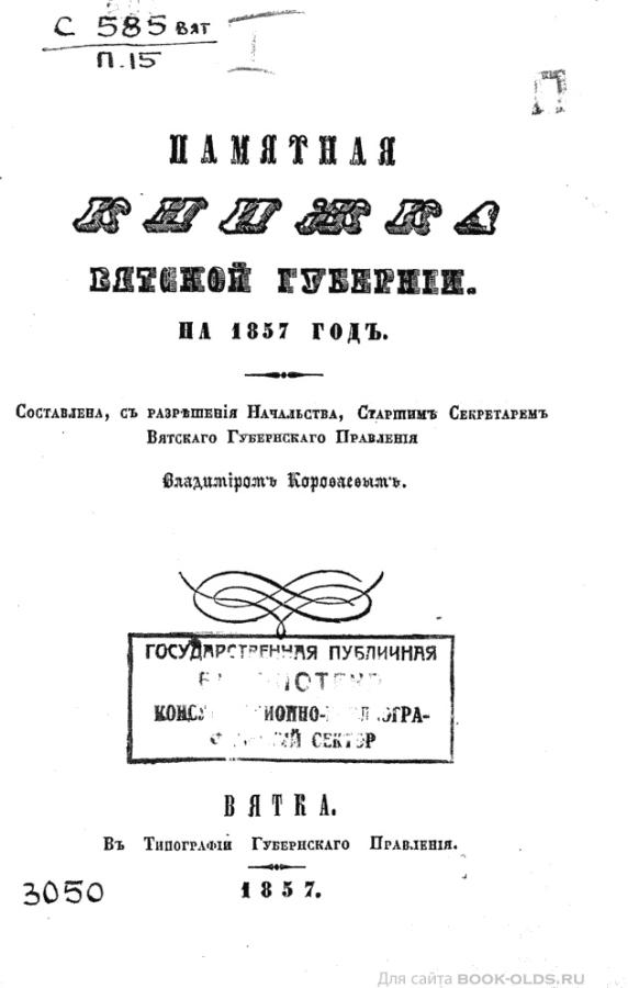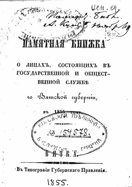 Памятная книжка о состоящих в Государственной и Общественной службе по Вятской губернии на 1855 год