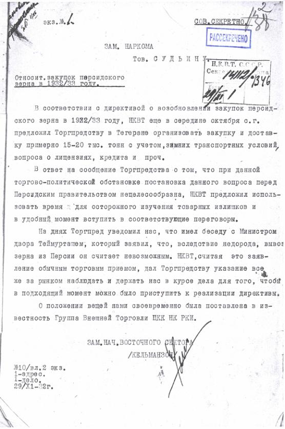 Докладная записка НКВТ относительно закупок зерна в Персии в 1932-1933 гг. 29 ноября 1932 г.
