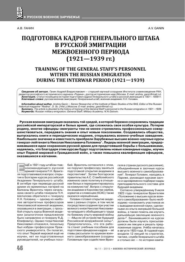Подготовка кадров Генерального штаба в русской эмиграции межвоенного периода (1921-1939 гг.)