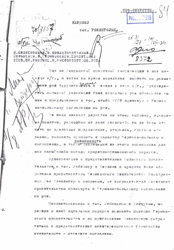 Записка НКВТ о переговорах с представителями Польского и Германского правительства по вопросу о соглашению по ржи. 9 августа 1931 г.
