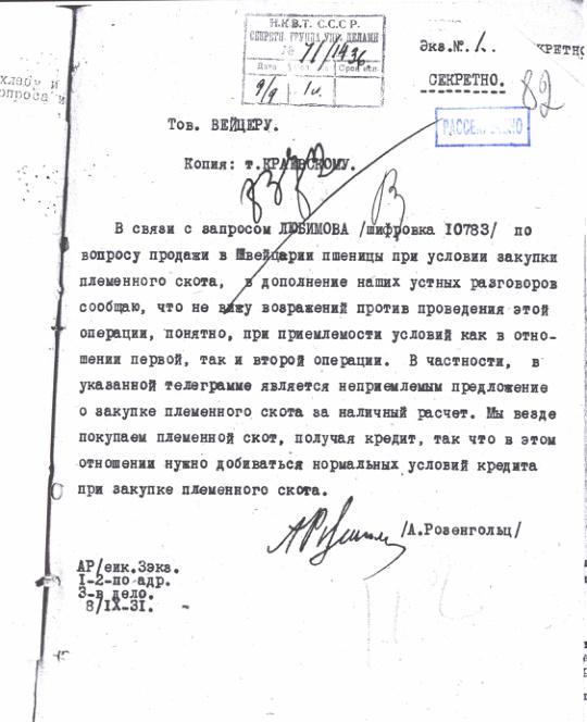 Служебная записка НКВТ о возможности закупки племенного скота в Швейцарии. 8 сентября 1931 г.