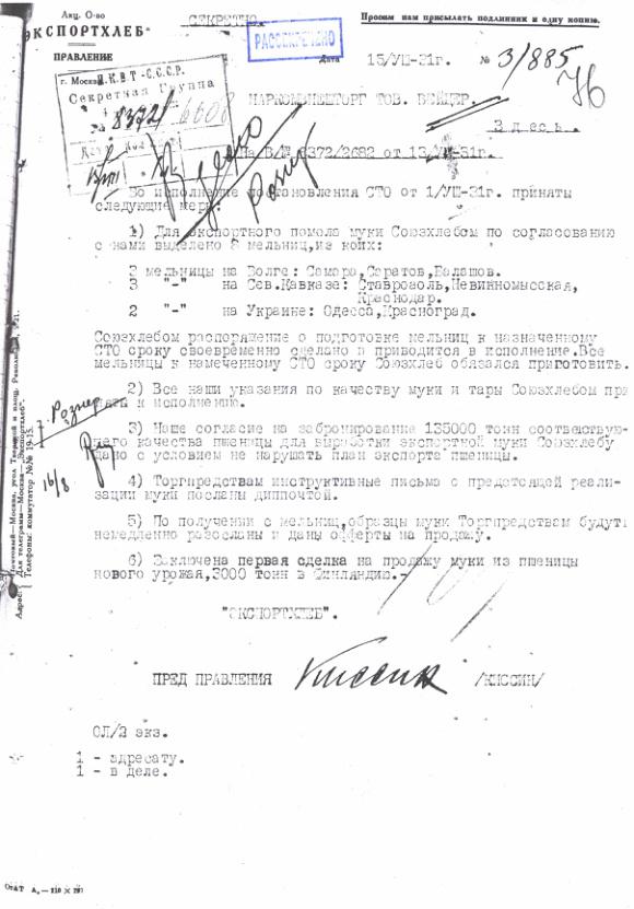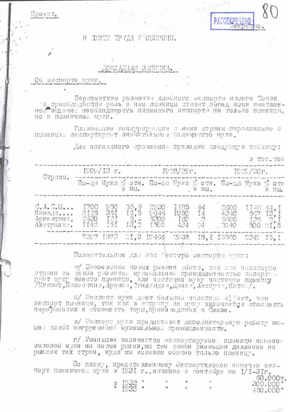 Докладная записка НКВТ в СТО о перспективах экспорта муки и проектом постановления. 17 июня 1931 г.