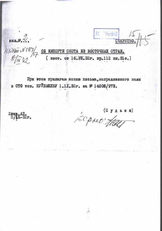 Докладная записка НКВТ об импорте скота из восточных стран. 3 сентября 1932 г.