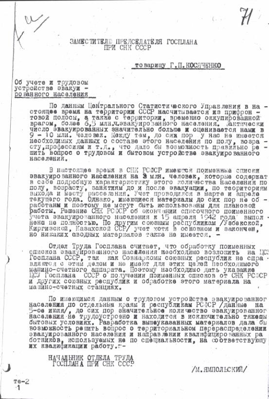 Докладная записка об учете и трудовом устройстве эвакуированного населения на 5 июля 1942 г.