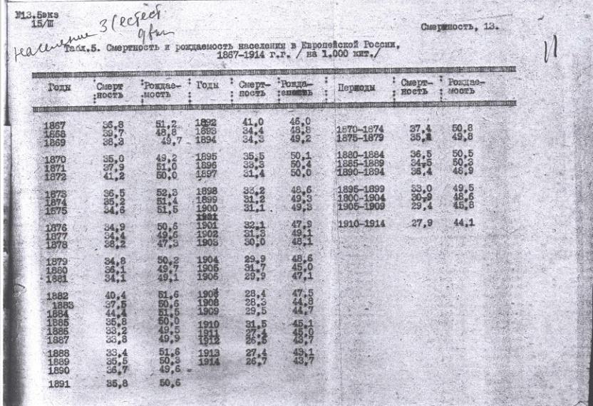 Таблица смертности и рождаемости населения в Европейской России в 1867-1914 гг. 15 марта 1934 г.