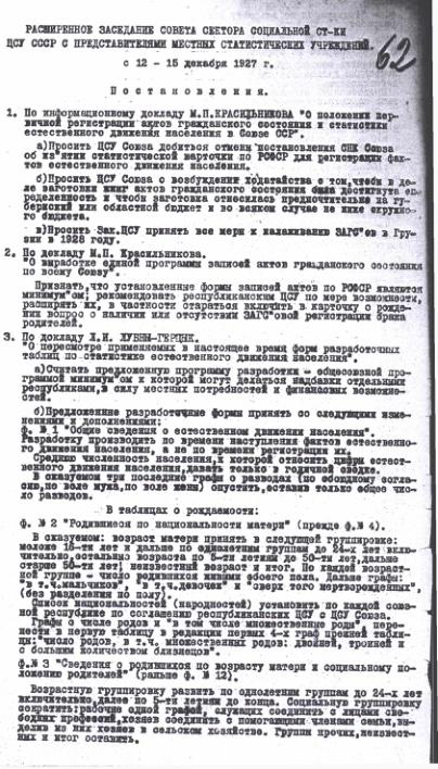 Постановления расширенного заседания совета сектора социальной статистики ЦСУ СССР 12-15 декабря 1927 г.