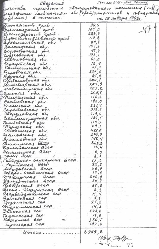 Сведения о количестве принятого эвакуированного населения по телеграфным сообщениям обл(край) исполкомов и совнаркомов республик в тыс. на 15 января 1942 г.