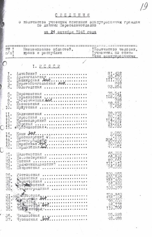 Сведения о количестве учтенных списками эвакуированных граждан по данным переселенческих отделов на 21 октября 1941 г.