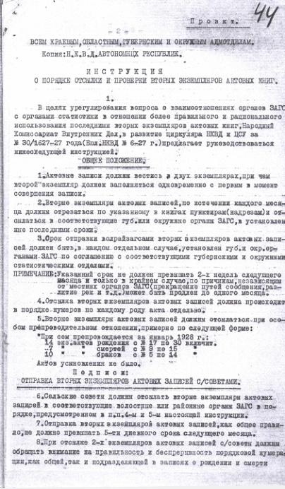 Проект инструкции о порядке отсылки и проверки вторых экземпляров актовых книг. 1928