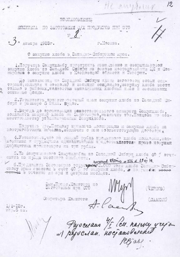 Постановление № 8 Комитета с.х. заготовок при СТО СССР. О закупке хлеба в Западно-Сибирском крае. 3 января 1933 г.