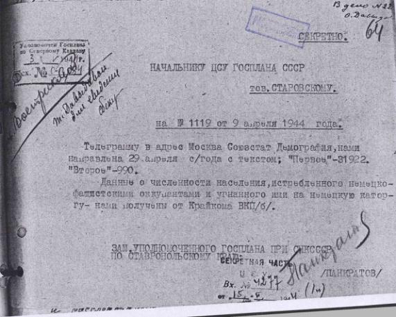 Сведения о количестве населения угнанного в Германию, количестве убитых и расстрелянных советских граждан по Северному Кавказу. 15 мая 1944 г.