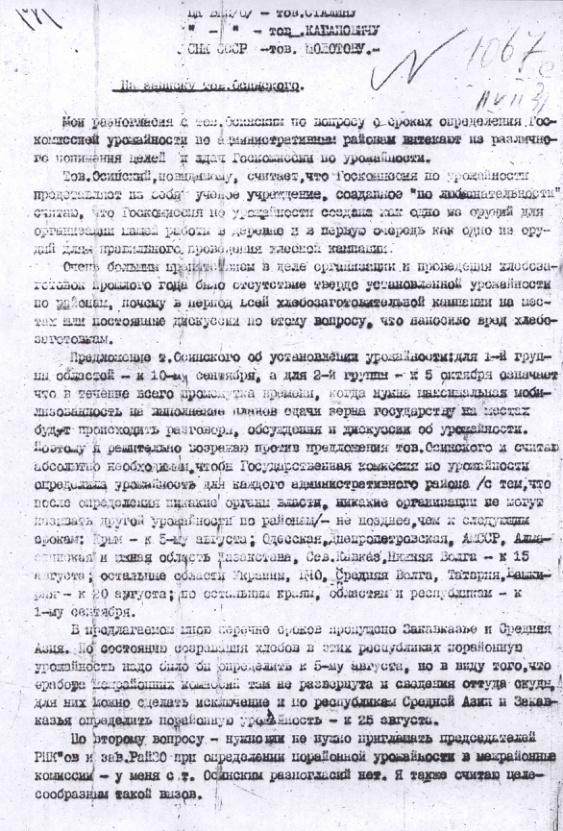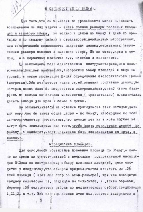 Записка в Сельхозотдел ЦК ВКП(б) об определении урожайности. 1933 г.