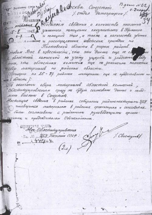 Сведения о количестве населения угнанного в Германию, количестве убитых и расстрелянных советских граждан по Полтавской области. 15 мая 1944 г.