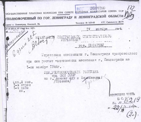 Расчет численности населения Ленинграда на 1 ноября 1944 г.