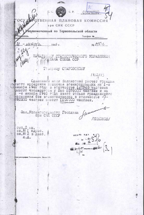 Расчет движения населения за период 1941-1945 гг. по Тернопольской области. 21 марта 1946 г.