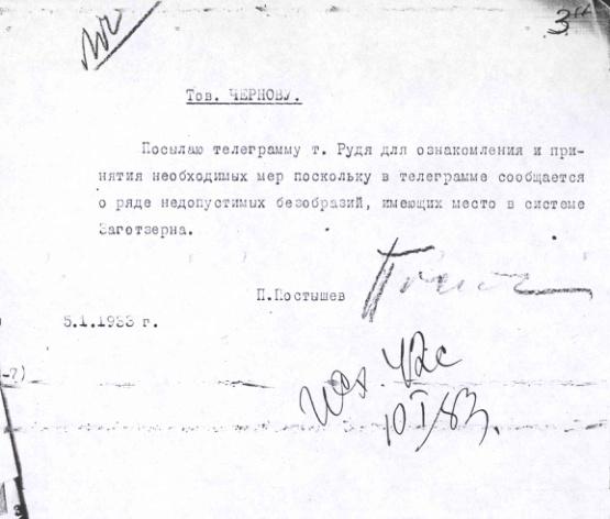 Телеграмма П.Г. Рудя о нарушения в системе Заготзерна. 5 января 1933 г.