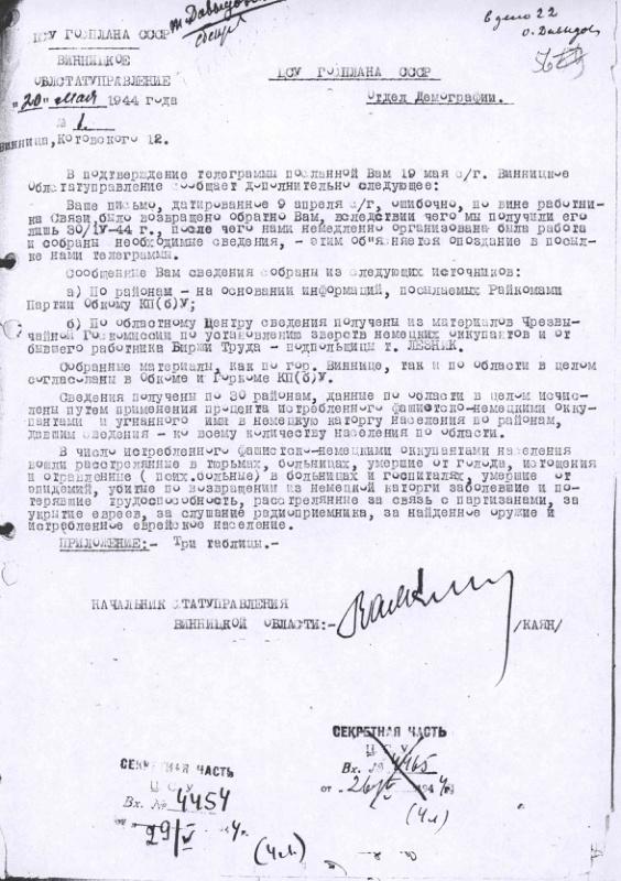 Сведения о количестве населения угнанного в Германию, количестве убитых и расстрелянных советских граждан по Винницкой области. 20 мая 1944 г.