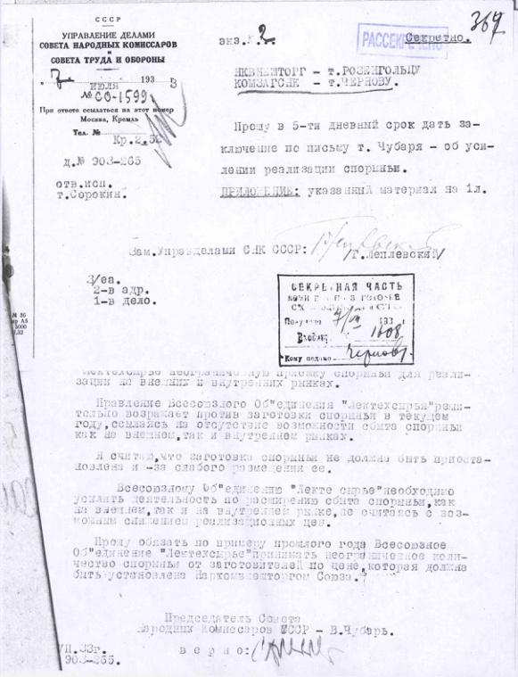 Письмо председателя СНК УССР Чубаря о заготовках спорыньи в 1933 году. 29 июня 1933 г.