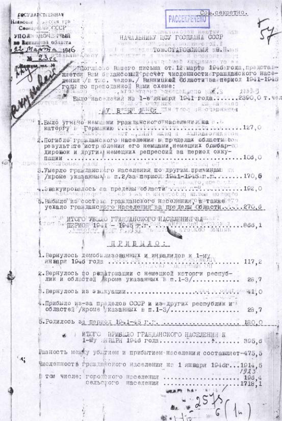 Расчет движения населения за период 1941-1945 гг. по Винницкой области. 22 марта 1946 г.