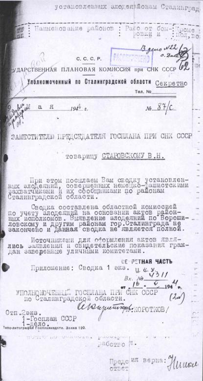 Сведения о количестве населения угнанного в Германию, количестве убитых и расстрелянных советских граждан по Сталинградской области. 9 мая 1944 г.