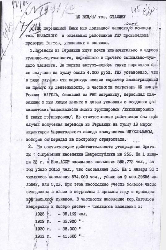Документы о проверке фактов изложенных бригадой писателей о положении в АССР Немцев Поволжья. 7 декабря 1933 г.