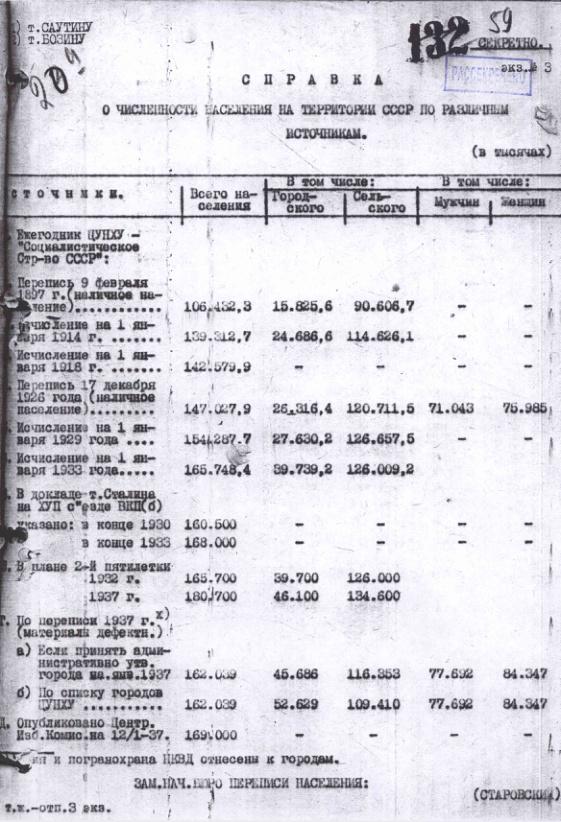 Справка ЦУНХУ о численности населения СССР по различным источникам. 1937 г.