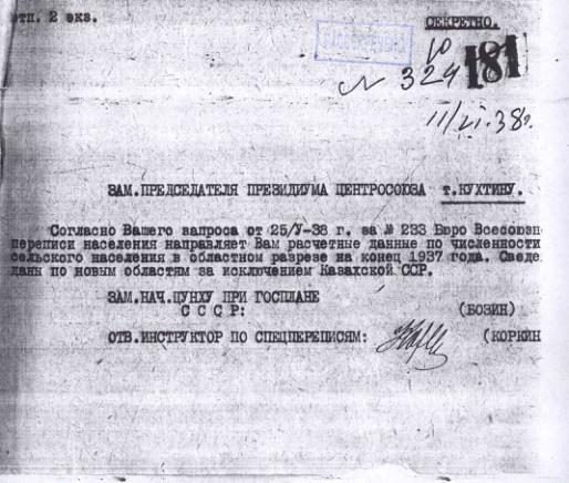 Справка ЦУНХУ с расчетными данными о численности сельского населения на конец 1937 года. 2 июня 1938 г.