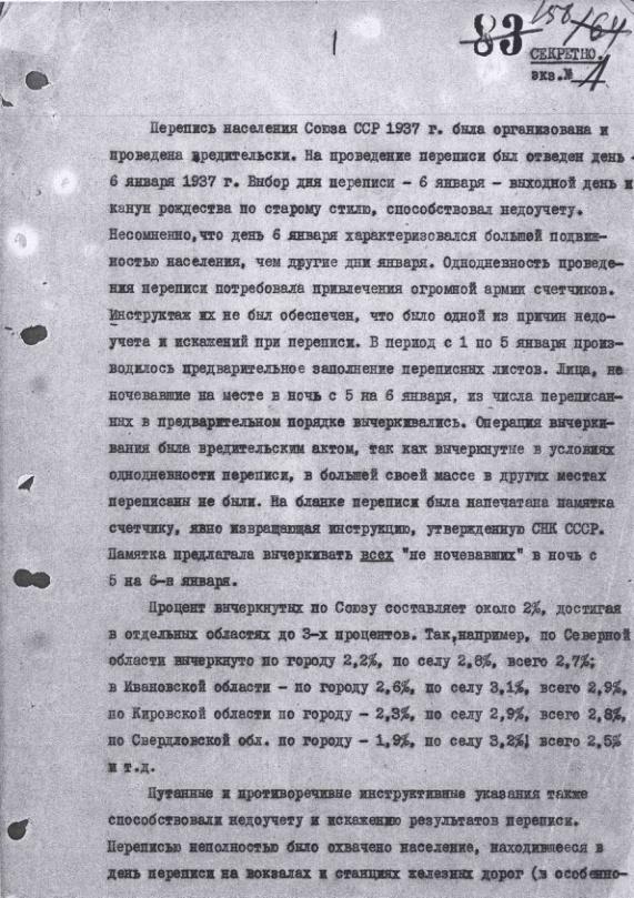 Проект предложений ЦУНХУ и обоснование внесения 4%-ой поправки к результатам переписи населения 1937 года. 19 августа 1937 г.