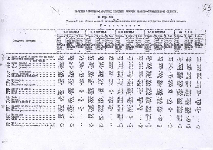 Бюджеты фабрично-заводских семейных рабочих промышленности Ивановской обл. в 1933 г. Удельный вес общественного питания и источники поступления продуктов домашнего питания.
