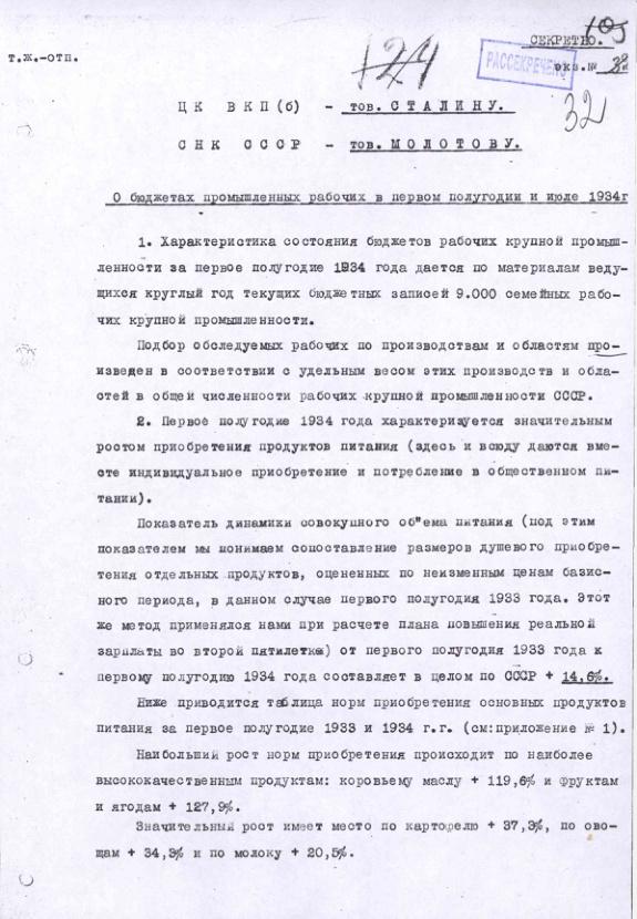 Справка ЦУНХУ о бюджетах промышленных рабочих в первом полугодии и июле 1934 г.