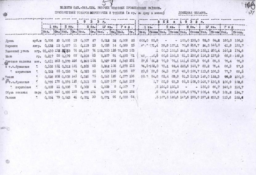 Бюджеты фабрично-заводских семейных рабочих Донецкой обл. Приобретение товаров ширпотреба и топлива в 1932-1933 гг.